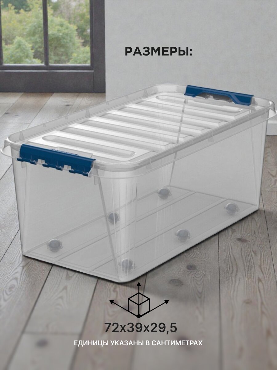 Объем ящика — 55 литров, размеры 72×39×29,5 см. Подходит для хранения постельного белья, одежды, игрушек, инструментов и других габаритных вещей.