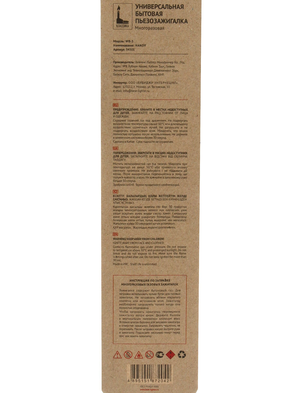 Зажигалка бытовая Wisen WB-3 HANDY: надёжное решение для кухни, дачи и пикника. Безопасность, долговечность, удобство — всё в одном устройстве.