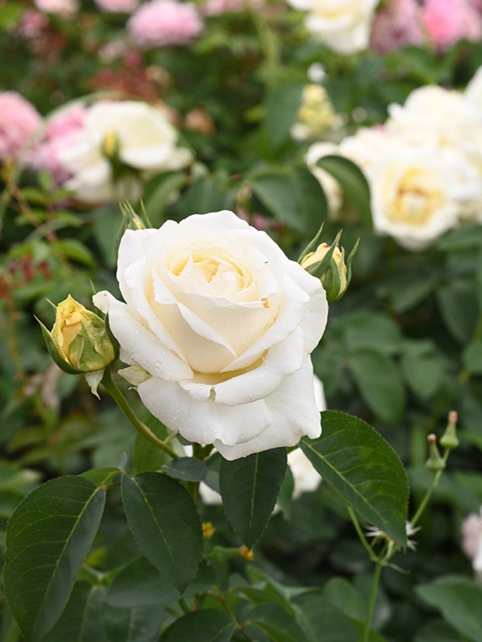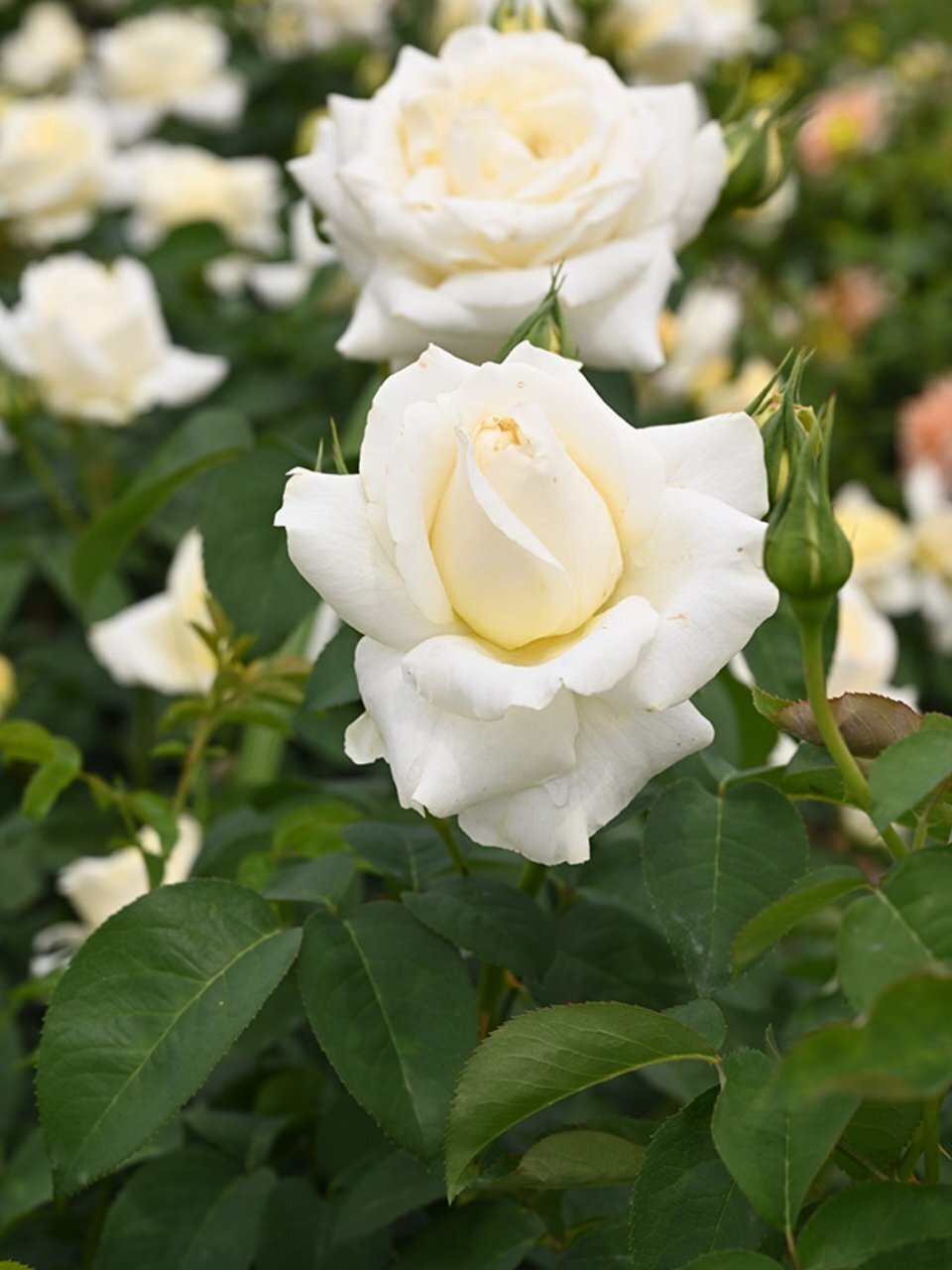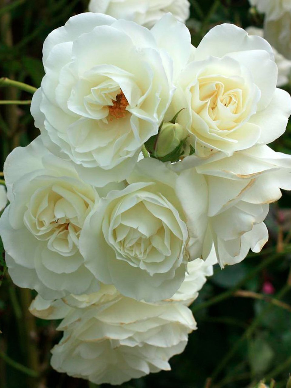 - Редкий сорт с чисто-белыми бутонами — создаёт элегантный вертикальный акцент и подходит для арок, беседок, заборов